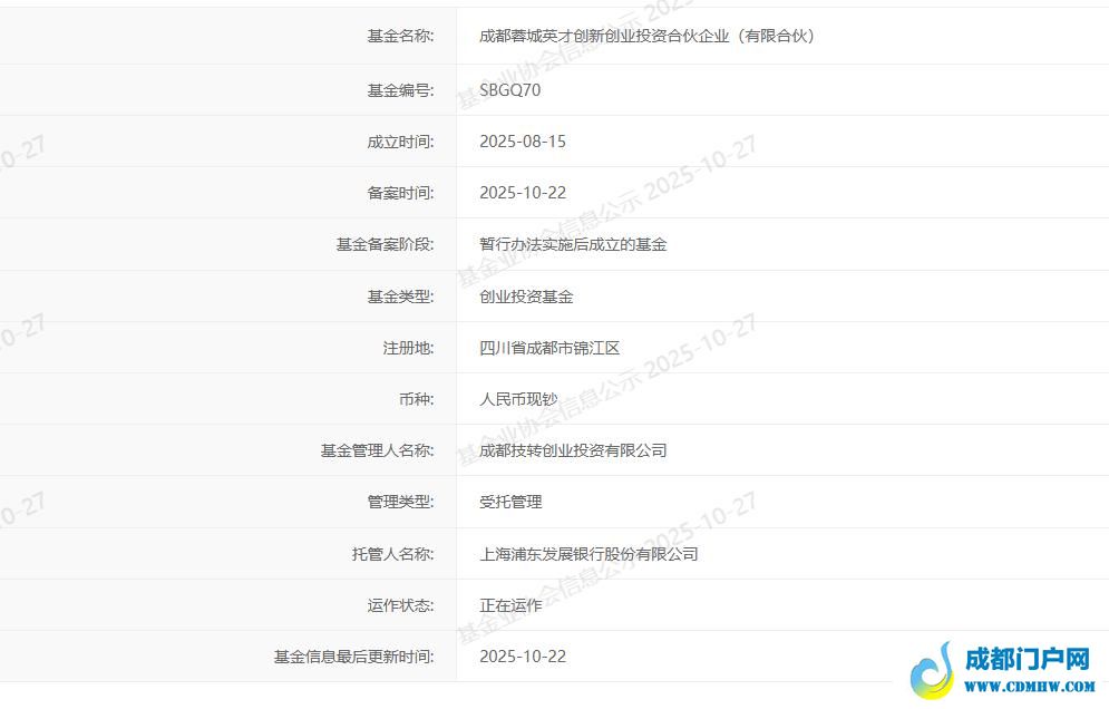 投资界消息,10月22日,成都蓉城英才创新创业投资合伙企业(有限合伙)在中国证券投资基金业协会完成备案,标志着“成都高层次人才创新创业投资基金”成立。该基金由成都人才发展集团、成都科技创新投资集团、成都锦江投资发展集团共同发起设立,主要出资方为成都技转创业投资有限公司、成都市锦江投资发展集团有限责任公司、成都人才发展集团有限责任公司、成都梧桐树创新创业投资合伙企业、成都天使股权投资基金有限公司。